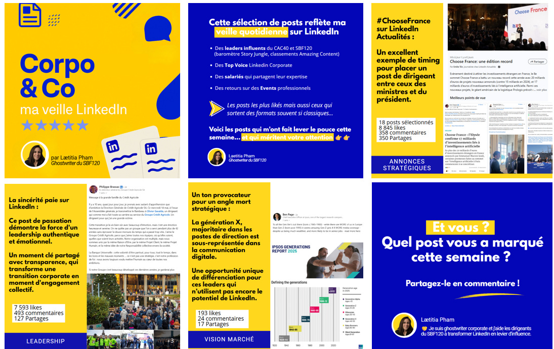 Pour changer ça, j’ai décidé de me créer un format signature : un carrousel de veille axé sur mon positionnement très niché — les posts LinkedIn du SBF 120 (soit les 120 plus grandes entreprises françaises).